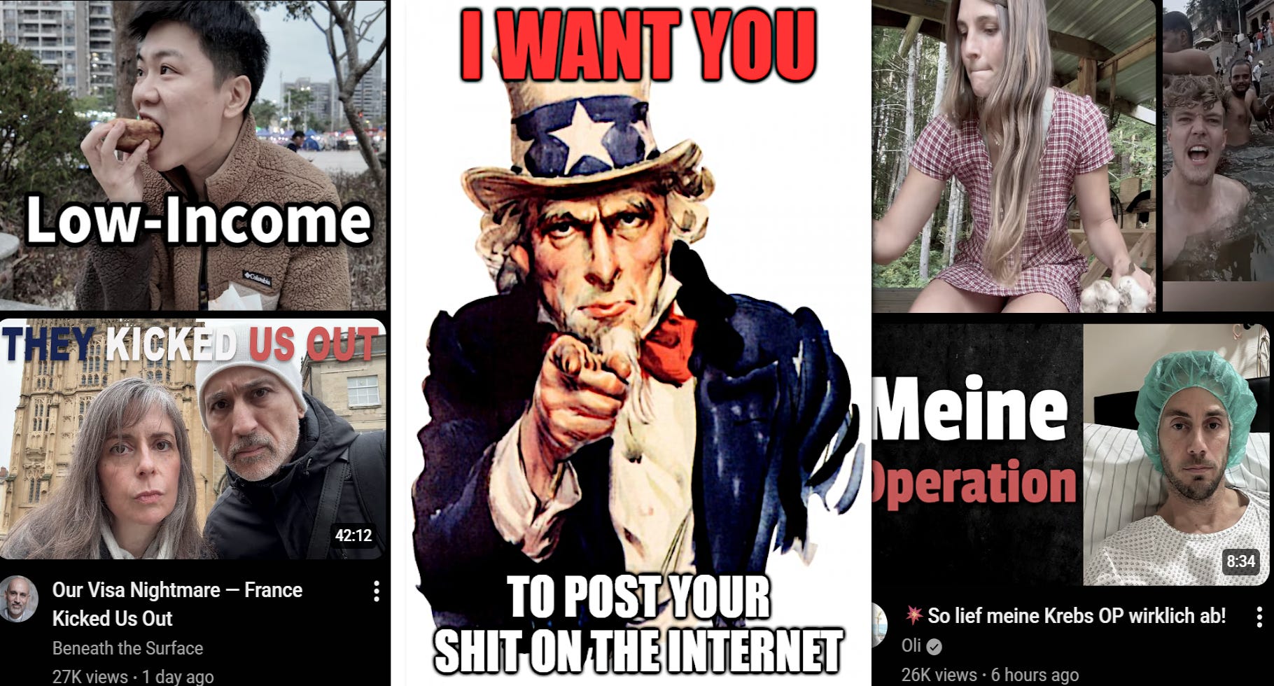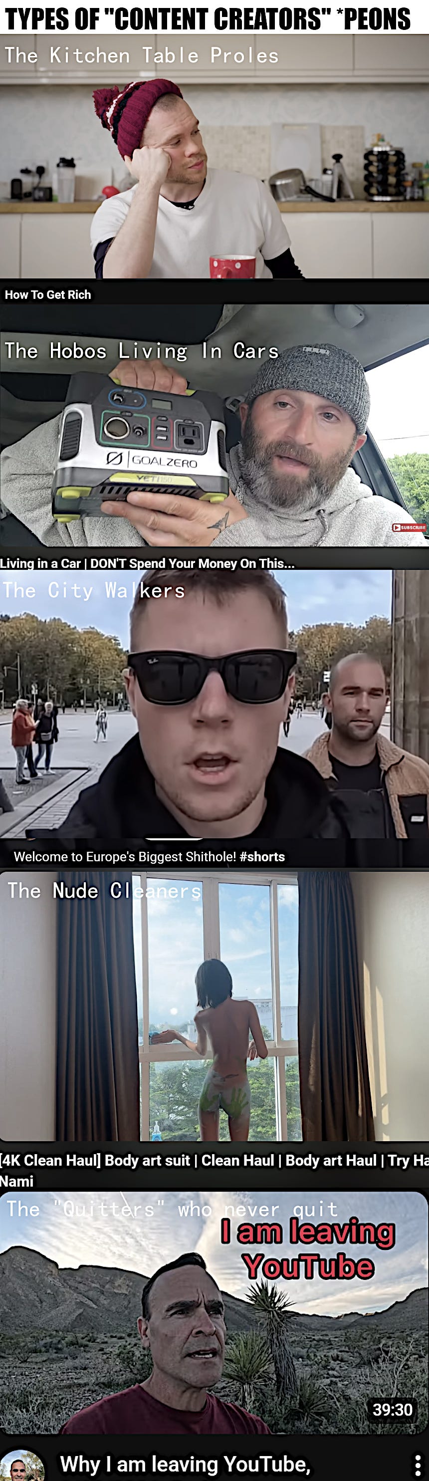 These creators are often forced into humiliating, debased behavior. The platforms deny responsibility. They claim that an “algorithm” determines what gets clicks. Creators must perform all kinds of cheap tricks that keep audiences engaged. If they succeed, the “algorithm” may show them to more viewers. Among the humiliating and degrading behaviors are: filming themselves in bed, with their children, or in the kitchen; pranks and silly games; promiscuity; crime; regurgitating the news; commentary; gossip; documenting mental illnesses or medical procedures; or simply walking through the neighborhood filming other peons.